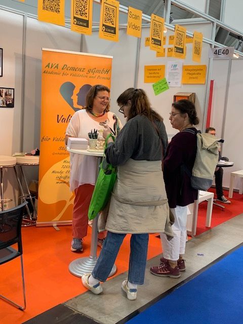 Dieses Jahr war vom 14.-16. Mai die PflegePlus in Stuttgart, die wichtigste Fachmesse im süddeutschen Raum und Plattform für fachlichen Austausch, Innovationen und Zukunftsperspektiven. An drei Messetagen informierten sich über 6.200 Fachbesucherinnen und -Besucher bei rund 180 ausstellenden Unternehmen. Auch die AVA Demenz gGmbH war dieses Jahr zum ersten Mal auf der Messe mit einem Stand vertreten. Dort konnten sich die Besucher und Besucherinnen über Validation und Demenz im Allgemeinen sowie unser aktuelles Kursprogramm informieren. Mit Stephani Maser, (Validationsmaster), Alexandra Paetzold (Büroleitung AVA Demenz gGmbH), Petra Wannicke (Validationsteacherin) und Carola von der Heide-Frey (Validationsanwenderin und Gruppenleiterin) hatten wir ein gut ausgebildetes Team vor Ort, das nicht nur Fachfragen kompetent beantworten, sondern auch Einblick in die praktische Umsetzung der Validationsprinzipien und der daraus resultierenden Erfahrungen geben konnte.